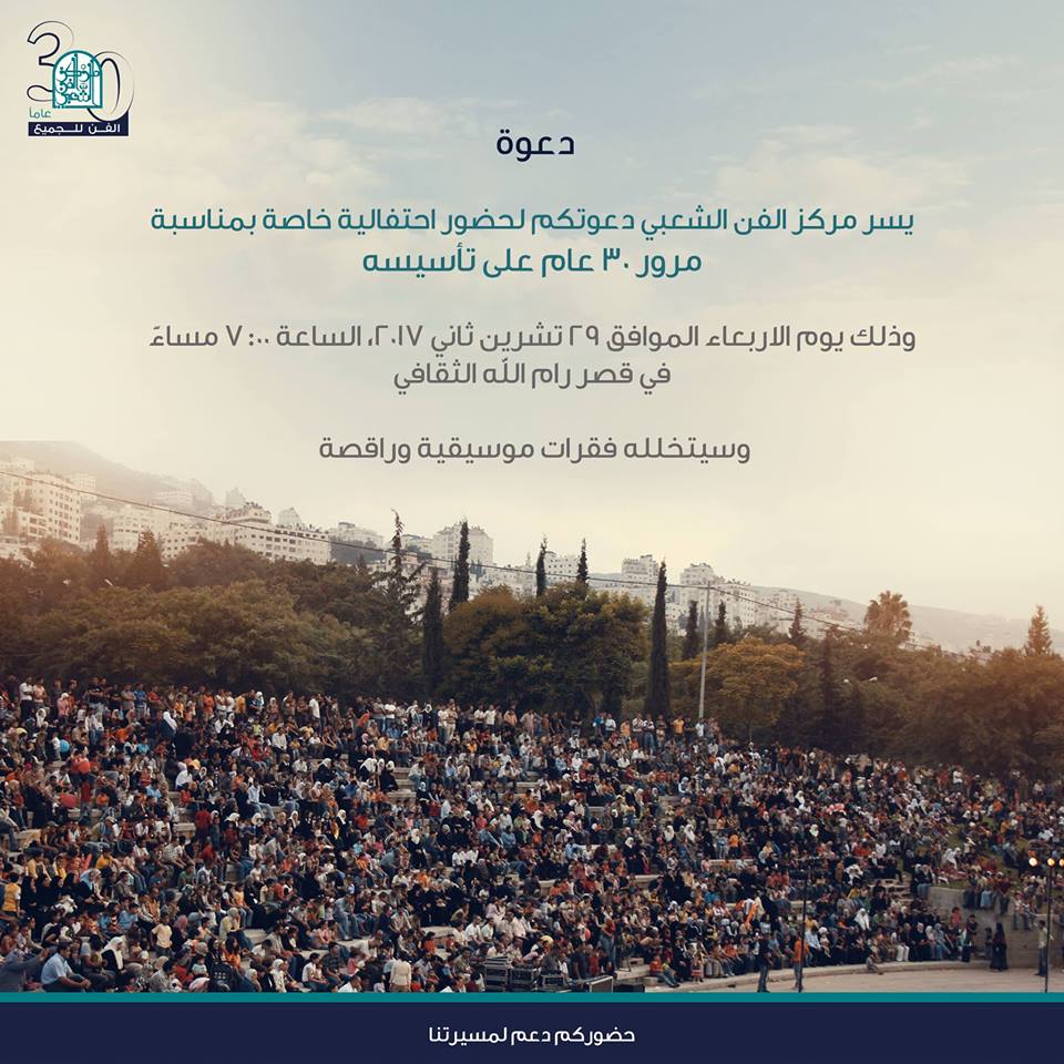 ومن المقرر أن ينظم مركز الفن الشعبي أمسية مساء يوم الأربعاء القادم في رام الله، احتفاءً بمرور 30 عاماً على تأسيسه، سيتم خلالها تقديم عروض لفرق ومؤسسات شريكة، وفرق فنية عمل معها المركز أو ساهم بتطويرها، إلى جانب عروض فنية خاصة بطلبة مدرسة الدبكة في المركز.