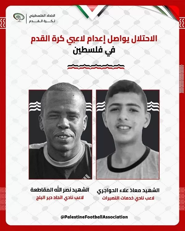 اعلام فتح  / من وفا- ودّعت الأسرة الرياضية الفلسطينية اليوم السبت، اثنين من أبنائها، بعد ارتقاء لاعب نادي خدمات النصيرات معاذ علاء الحواجري أثناء انتظاره للمساعدات الإنسانية في منطقة النصيرات، وسط قطاع غزة، واستشهاد لاعب اتحاد دير البلح، نصر الله المقاطعة جراء استهدافه من قبل قوات الاحتلال الإسرائيلي.