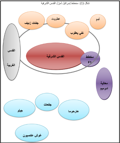 - عزل القدس عن محيطها الفلسطيني وقطع التواصل الجغرافي والسكاني بين القدس والتجمعات الفلسطينية وتقويض إقامة دولة فلسطينية وعاصمتها القدس.