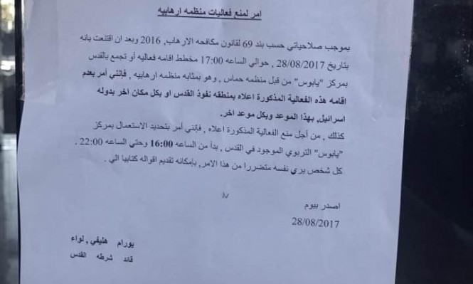 عرب ٤٨- أغلقت قوّات الاحتلال، أمس الإثنين، مركز "يبوس" الثقافي في القدس، ومنع إقامة ندوة "الوصاية على المسجد الأقصى في ظلّ إدارة الاتفاقيات"، بحجة أنّ الندوة نظمتها "حماس".