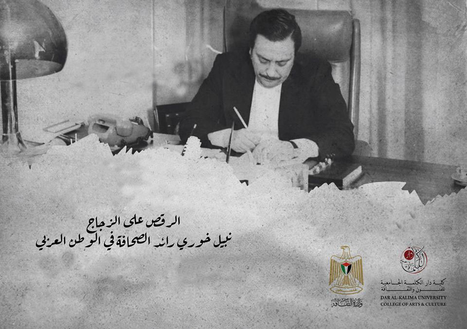 رام الله- اعلام فتح- أطلقت دار الكلمة الجامعية للفنون والثقافة، تحت رعاية وبحضور وزير الثقافة د. إيهاب بسيسو، فيلم "الرقص على الزجاج: نبيل خوري رائد الصحافة في الوطن العربي" للمخرجة محاسن ناصر الدين، في متحف ياسر عرفات بمدينة البيرة، مساء اليوم، بحضور د. أنور أبو عيشة وزير الثقافة الأسبق، ود.أحمد صبح مدير عام مؤسسة ياسر عرفات، والقس د. متري الراهب مؤسس ورئيس دار الكلمة، وممثلين عن أسرة خوري، ونخبة من المثقفين والفنانين والمهتمين.