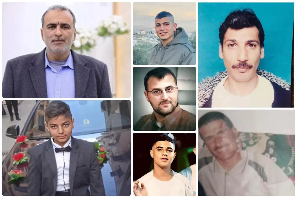 والشهداء السبعة هم: أخصائي جراحة عامة في مستشفى جنين أسيد جبارين (51 عاما)، حيث تم استهدافه في محيط المستشفى، والمعلم علام جرادات (48 عاما)، الذي كان متوجها إلى رأس عمله في مدرسة وليد أبو مويس الأساسية للبنين، والطالب ابن الصف التاسع من مدرسة ذكور الكرامة الأساسية الثانية محمود أمجد حمادنة (15 عاما)، ومعمر محمد ذيب ابو عميرة (50 عاما)، وأمير عصام محمد أبو عميرة (22 عاما)، وأسامة محمد نعيم حجير، وباسم محمود صالح تركمان، وهو شقيق الشهيدين محمد الذي ارتقى أثناء اجتياح مخيم جنين عام 2002، ولطفي الذي ارتقى في الانتفاضة الأولى.