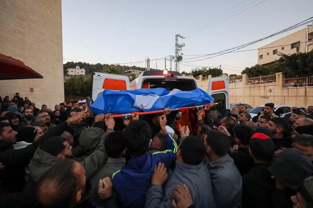 مواطنون يشيعون جثامين الشهداء من أمام المستشفى التركي في طوباس (الأناضول)