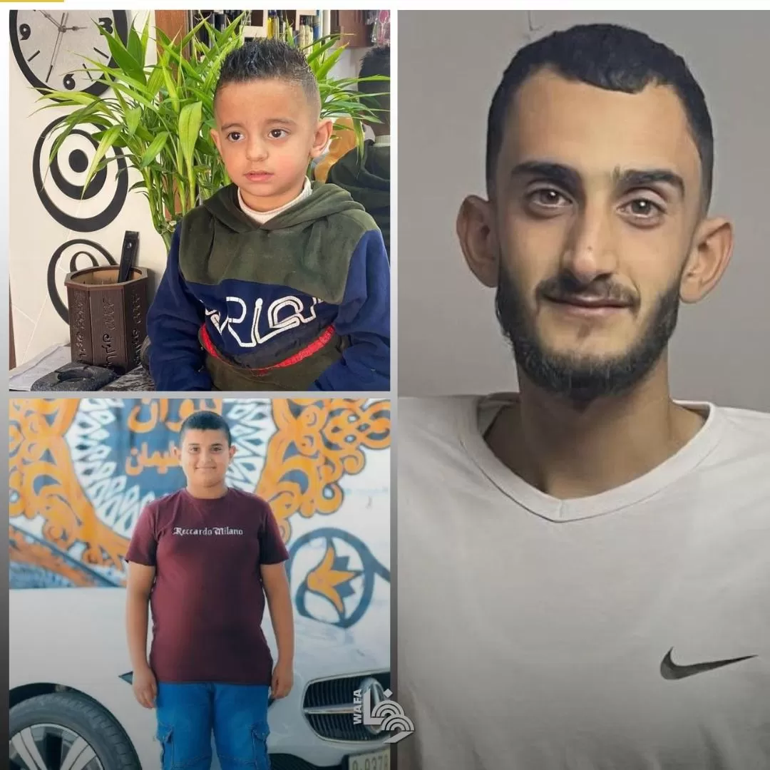 وأفادت مصادر أمنية لـ"وفا"، بأن الشهداء هم: رضا علي أحمد بشارات (9 أعوام)، وحمزة عمار أحمد بشارات (10 أعوام)، وآدم خير الدين أحمد بشارات (23 عاما)، وقد اختطف الاحتلال جثامينهم.