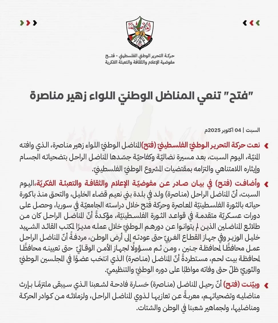 فتح تنعى المناضل الوطني اللواء زهير مناصرة