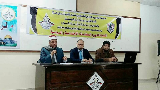 غزة -إعلام فتح- عقدت حركة التحرير الوطني الفلسطيني "فتح" - إقليم شمال غزة- قلعة الشهيد القائد جمال أبو الجديان وبالتعاون مع جامعة غزة فرع الشمال ندوة فكرية بعنوان (التطرف الديني وإنعكاساته الإجتماعية والسياسية) في باكورة برنامج التعبئة الفكرية لحركة فتح في الإقليم بحضور الأستاذ الدكتور رياض الخضري رئيس مجلس الأمناء وعضو اللجنة التنفيدية لمنظمة التحرير، والأستاذ الدكتور عبد الجليل صرصور رئيس الجامعة وبمشاركة نائب أمين سر المجلس الثوري لحركة فتح د.فايز أبو عيطة وأمين سر الإقليم الأخ حاتم أبو الحصين وقيادة الإقليم والمناطق والمكاتب الحركية ونخبة من الأكاديميين والشخصيات الإعتبارية وأصحاب الرأي والوجهاء .